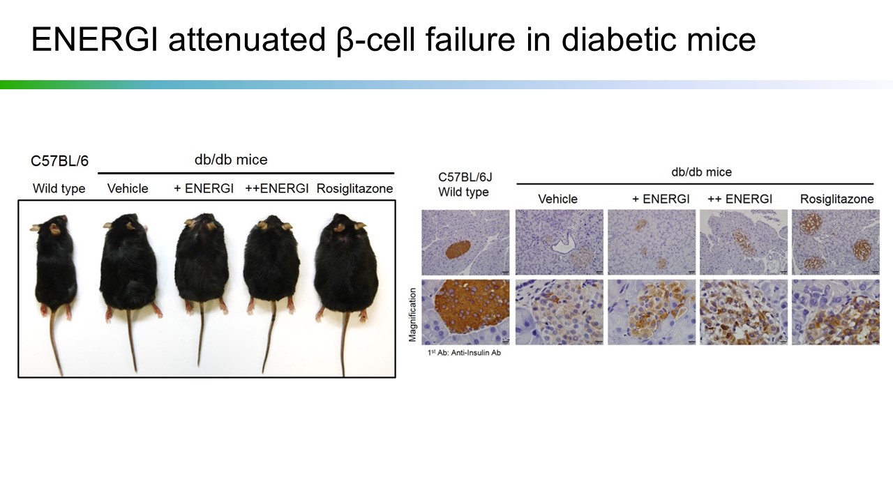 The World Health Organization (WTO) employs diabetes as the criteria in defining metabolic syndrome, blaming the syndrome on the resistance of insulin, which leads to overweight, high blood glucose, hyperlipemia, and hypertension. Energenesis Biomedical's ENERGI-F702 is proven to be capable of stimulating glucose transporting protein 4 (GLUT4) expression, which facilitates transfer of GLUT4 to cell membrane and thereby increases capability of cells to absorb glucose. Study on second-type diabetic model mice (db/db mice) shows that feeding of F702 to diabetic small mice, in long- or short-term, can increase tolerance for glucose and will not lead to extra weight, unlike Rosiglitazone, a TZD-type hypoglycemics.