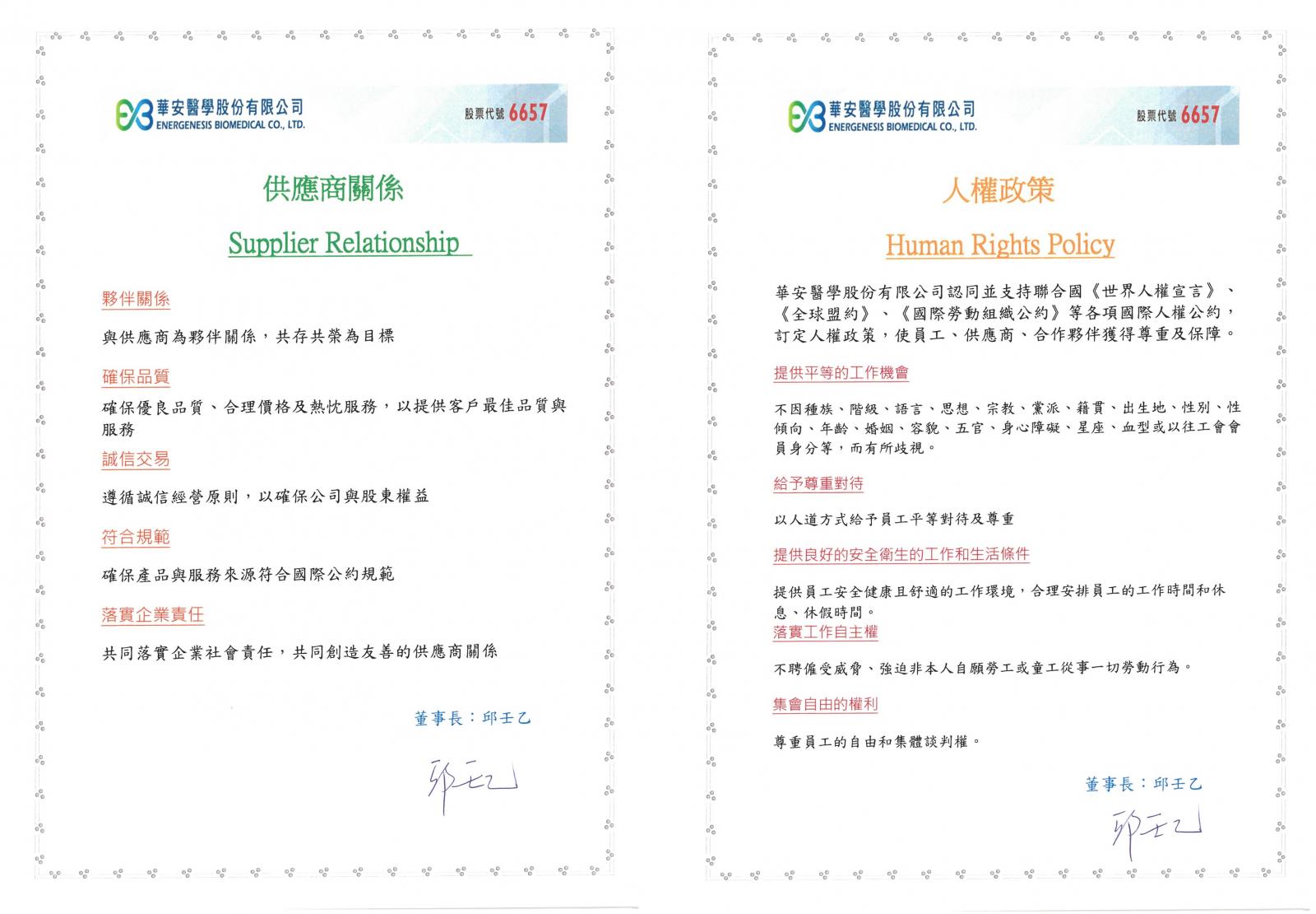 為履行企業社會責任,保障全體同仁、客戶及利害關係人之基本人權,本公司支持《聯合國世界人權宣言》、《聯合國商業與人權指導原則》、《聯合國全球盟約》與《聯合國國際勞動組織》等國際人權公約之原則,持續推行如下之人權政策:
