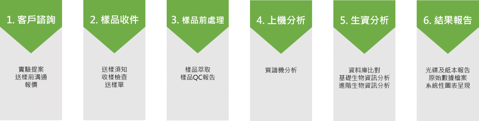 樣品前處理:我們提供樣品萃取及電泳服務,樣品處理完後會進行品質確認,確認樣品狀況適合實驗服務。