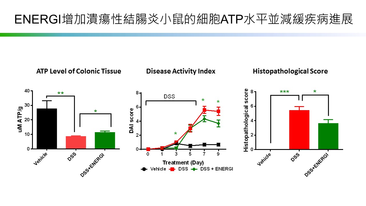 華安醫學目前已針對 IBD 完成動物臨床前實驗評估,發現 ENERGI-F704 具有減緩腸道發炎現象。