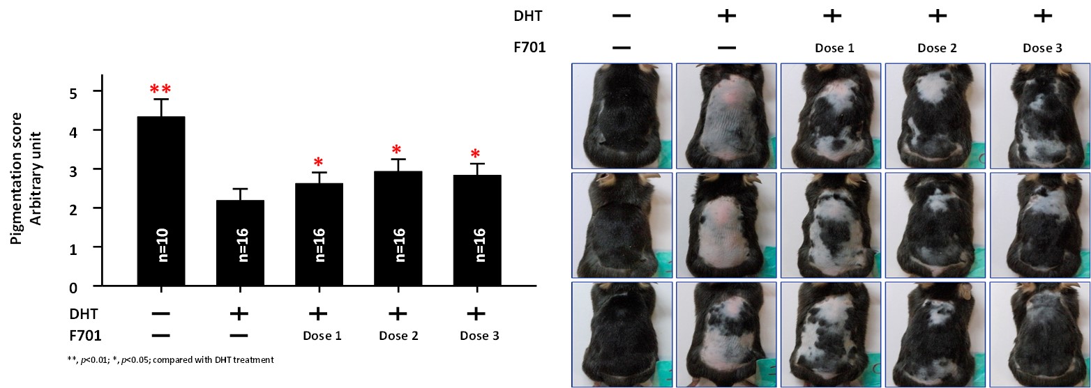 ENERGI-F701 is meant to cure hair loss of men and women. We've proven that via enhancing the activity of AMPK, ENERGI-F701 can boost the ATP of human follicle dermal papilla cells (HFDPCs, Figure 1) thereby slowing down the aging speed and prolonging hair cycle (Figure 2). Meanwhile, animal test using Dihydrotestosterone (DHT) in simulating baldness shows that ENERGI-F701 is capable of alleviating the effect of DHT inhibiting hair growth (Figure 3), which underscores its potential for curing balding of men and women.