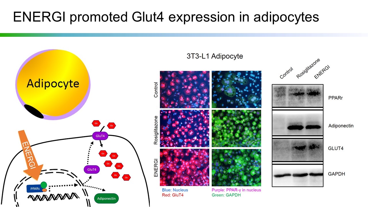 The World Health Organization (WTO) employs diabetes as the criteria in defining metabolic syndrome, blaming the syndrome on the resistance of insulin, which leads to overweight, high blood glucose, hyperlipemia, and hypertension. Energenesis Biomedical's ENERGI-F702 is proven to be capable of stimulating glucose transporting protein 4 (GLUT4) expression, which facilitates transfer of GLUT4 to cell membrane and thereby increases capability of cells to absorb glucose. Study on second-type diabetic model mice (db/db mice) shows that feeding of F702 to diabetic small mice, in long- or short-term, can increase tolerance for glucose and will not lead to extra weight, unlike Rosiglitazone, a TZD-type hypoglycemics.