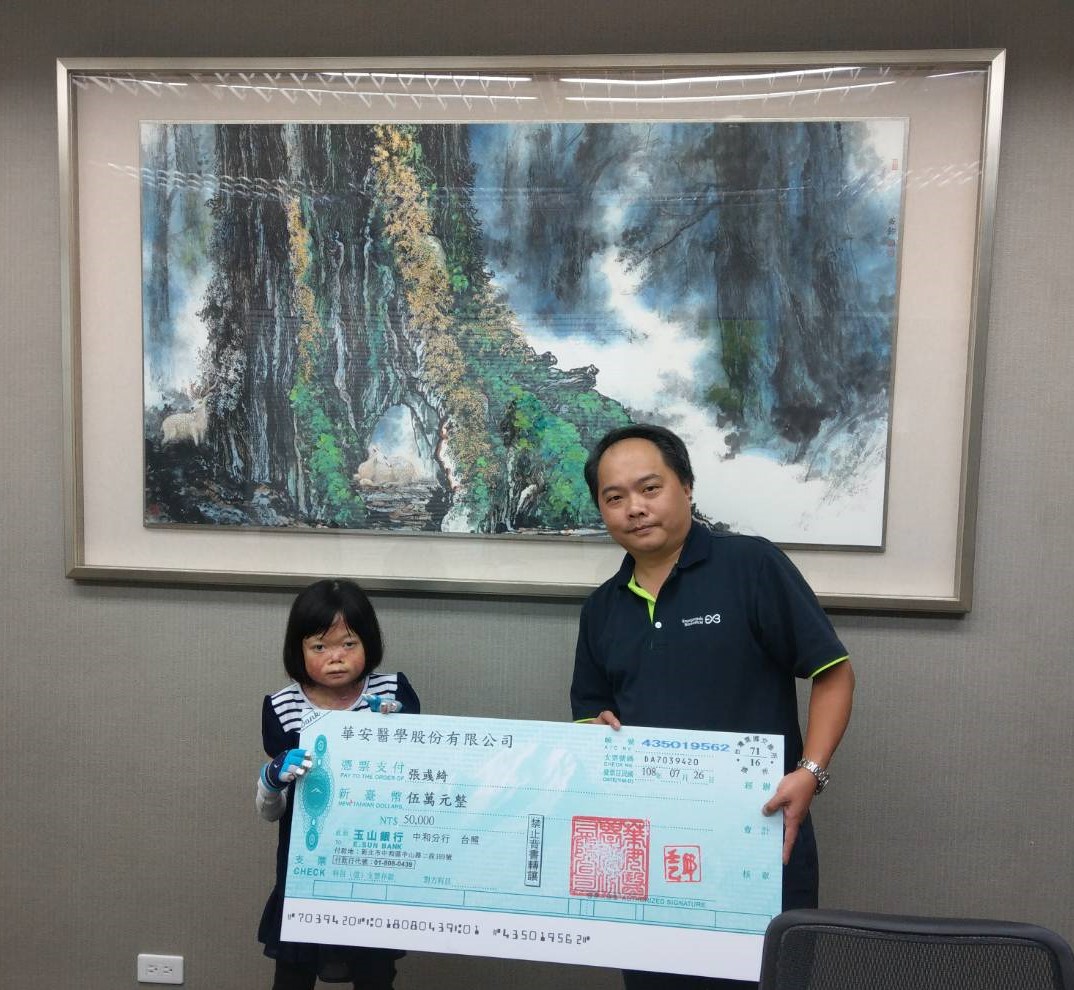 關於我們 > 關於我們 > 大事記要 > 公告 2019-07-30 本公司頒贈泡泡龍病友張彧綺小朋友獎學金,期許她繼續奮發向上 彰化芬園國小學童張彧綺自幼罹患俗稱「泡泡龍」的先天性表皮鬆解性水皰症罕見疾病。但是她不向命運低頭,克服病痛、勇於學習。在校成績名列前茅,尤其英文演講更是屢獲佳績,今年更一舉榮獲總統教育獎殊榮。 本公司致力於新藥研發,尤其對於罕見疾病的治療開發更是不遺餘力。為了鼓勵張彧綺小朋友繼續奮發向上,陳翰民總經理特別頒發獎學金 5 萬元整。期許她未來更精益求精,做為大家學習榜樣。 back