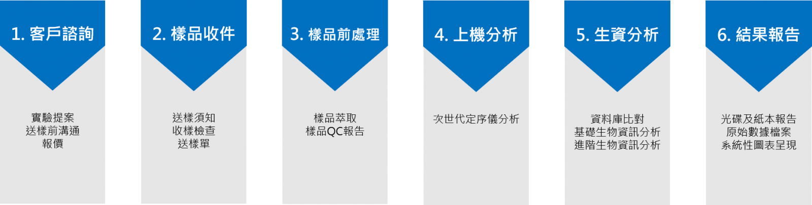 樣品前處理:我們提供樣品萃取及電泳服務,樣品處理完後會進行品質確認,確認樣品狀況適合實驗服務。